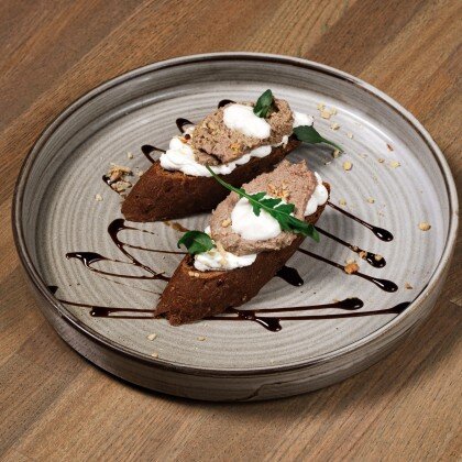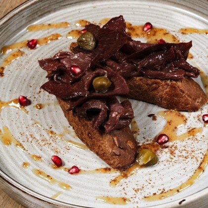 С пастой из авокадо и сливочного сыра. Сервируется томатами и бобами эдомаме в специях и сыром страчателла
