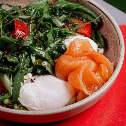 На кокосовом молоке. Сервируется свежим шпинатом, авокадо и помидорами черри