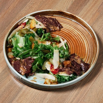 Подаётся на подушке из рикотты, дополняется страчателлой и рукколой