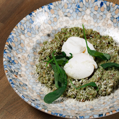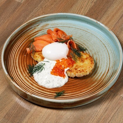 Твороная вафля со шпинатом, дополняется морской капустой, свежим огурцом и форелью малой соли