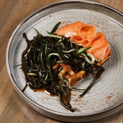 Дополняются яйцом пашот, форелью малой соли, соусом тартар и красный икрой