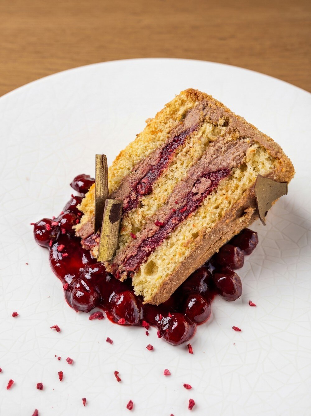 Коржи на миндальной и овсяной муке с малиновым конфитюром. Крем на основе обезжиренного творога и несладкого шоколада с добавлением сиропа топинамбура