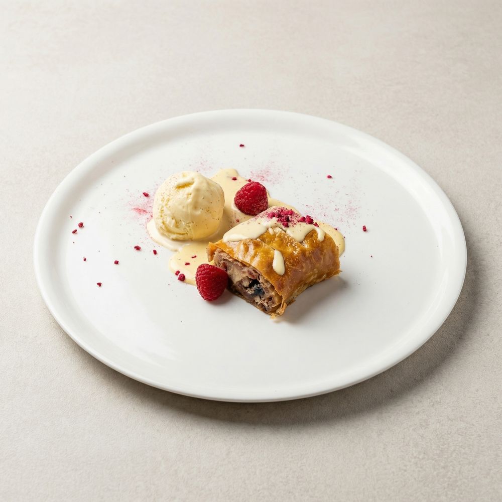 Хрустящие слои теста Фило, запеченные с яблоками и орехом. Дополняется мороженым Париж и соусом сабайон