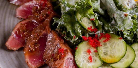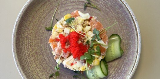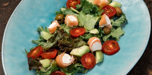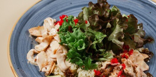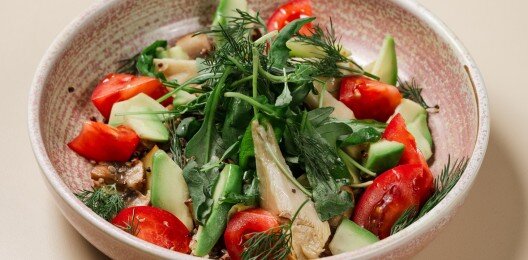 Киноа, авокадо, эко салат фриллис, вяленые черри, яйцо пашот, форель, приготовленная по технологии су вид, медово-горчичная заправка