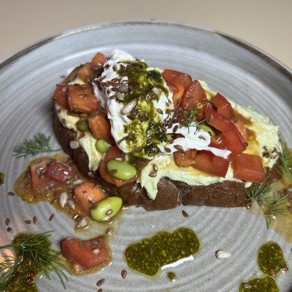Зерновой хлеб, паштет (печень куриная, молоко, лук репчатый, масло сливочное, яйцо куриное), сыр рикотта, сыр страчателла, кедровый орех, руккола