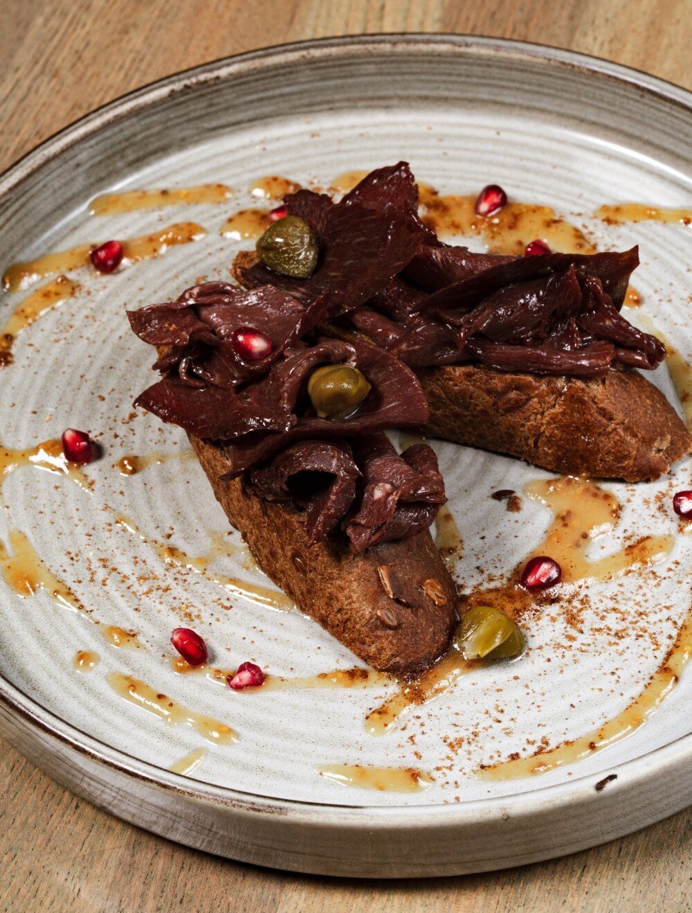 Зерновой хлеб, сыровяленая оленина, медово-горчичный соус, каперсы