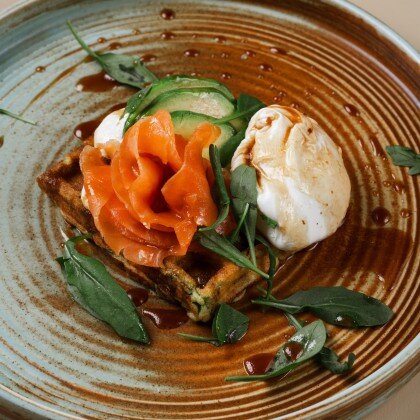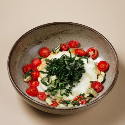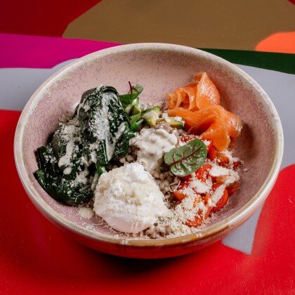 Эко салат романо, руккола, киноа, плоды эдомаме, азербайджанские томаты, два яйца пашот, форель малой соли